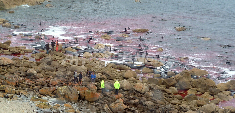 クジラの大群が岩場に乗り上げる、150頭以上が死亡 タスマニア島