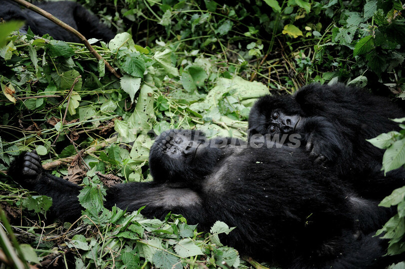 前月28日、レンジャーたちは、行く手をさえぎる蔓(つる)をなたで切り開きながらジャングルを分け入り、2時間ほどでミケノ火山(Mount Mikeno)の中腹の開けた場所に到達。彼らが目にしたものは、兄弟の身体から虫を一匹ずつ取り除くゴリラの子どもや、母親の背中にしがみついたままこちらを見つめる赤ちゃんゴリラの姿だった。大人のゴリラたちは超然としているのに対し、子どもたちは訪問者たちに興味津々で、同行した記者の足を2回叩くという「おふざけ」をやってから茂みに隠れる子もいた。