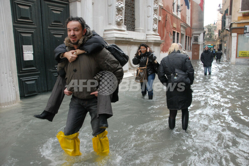 気象関係者らは、過去数日間のうちにイタリア北部で豪雨と豪雪が発生したことに加え、強い南寄りの風が続いていたことで、記録的な高潮を招いたとみている。(c)AFP