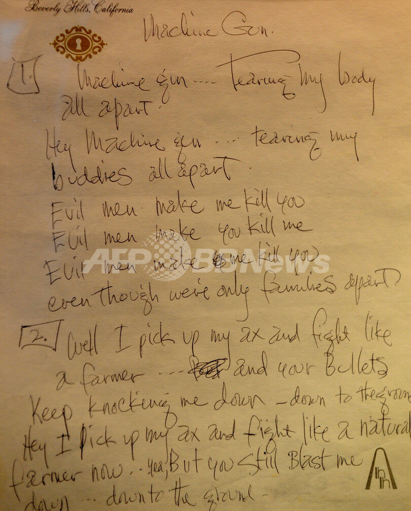 ニュース ライフ 「グラミー博物館」ロサンゼルスにオープン 2008年12月4日 10:03 発信地:ロサンゼルス/米国 [ 北米 米国 ] このニュースをシェア ‹ › ❮ 8/19 ❯ 米ロサンゼルス(Los Angeles)で6日にオープンする「グラミー博物館(Grammy Museum)」に展示された、ギタリスト、ジミ・ヘンドリックス(Jimi Hendrix)直筆の「マシンガン(Machine Gun)」の歌詞(2008年12月2日撮影)。(c)AFP/Robyn BECK 画像作成中 ! 【12月4日 AFP】グラミー賞(Grammy Awards)にゆかりの品々を展示する「グラミー博物館(Grammy Museum)」が、6日に米ロサンゼルス(Los Angeles)でオープンする。オープンに先立ち、3日からは記念イベントが行われる。グラミー賞関連のほか、有名ミュージシャンの楽器や直筆の歌詞など、音楽史を扱った様々な品が展示される。(c)AFP ライフ 一覧へ> メディア・報道関係・法人の方向け 写真・動画 購入のお問合せ>