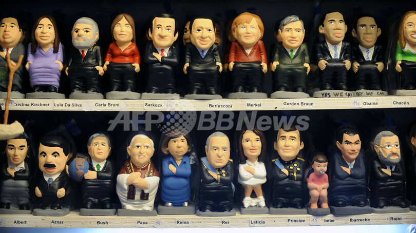 【12月3日 AFP】スペインのバルセロナ(Barcelona)で開かれているクリスマス市に登場した、クリスマス伝統の人形「カガネル(caganer、「排便」の意味)」の各国政治家版。バラク・オバマ(Barack Obama)次期大統領やニコラ・サルコジ(Nicolas Sarkozy)仏大統領夫妻のカガネルも並んでいる。