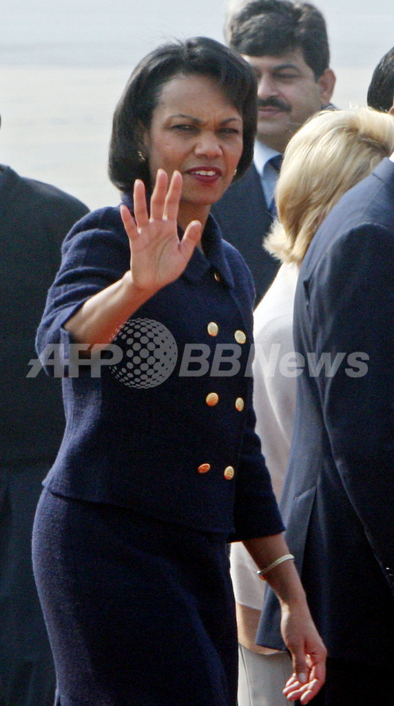 米国務省高官によると、ライス長官はテロとの戦いに協力するよう、同盟国である印パ両国に圧力を掛けるものとみられる。(c)AFP/Sylvie Lanteaume