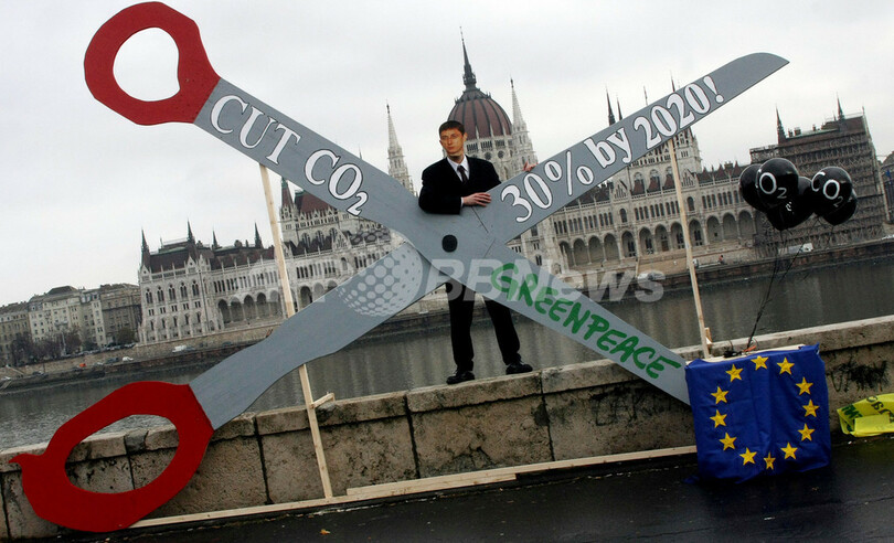 【12月4日 AFP】ハンガリーの首都ブダペスト(Budapest)で3日、国際環境保護団体グリーンピース(Greenpeace)が、欧州連合(EU)に温暖化対策として2020年までに二酸化炭素削減を30%削減するよう訴える抗議デモを展開。その一環として、ジュルチャーニ・フェレンツ(Gyurcsany Ferenc)首相の仮面をつけた活動家が、EUの二酸化炭素排出量削減を象徴する巨大なはさみを手に、街頭劇も演じた。