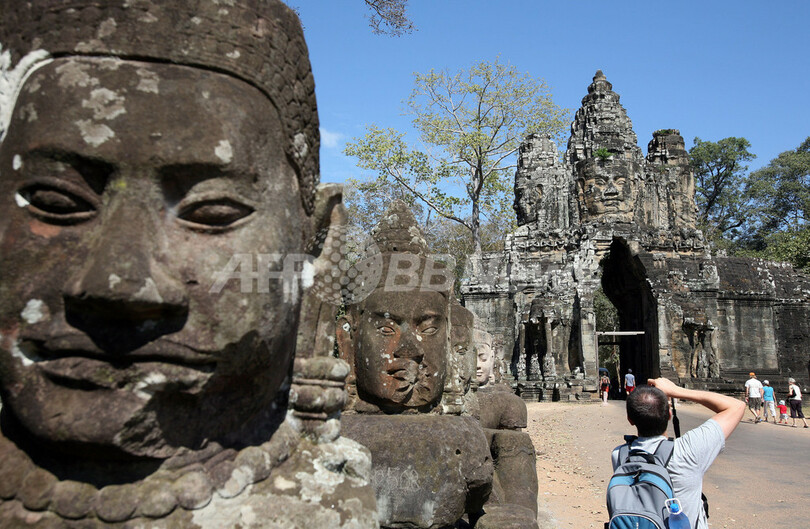 【12月7日 AFP】2007年のカンボジアへの海外旅行者数は200万人を超え、依然として観光業は同国の数少ない外貨獲得源の1つとなっている。同国では内戦から数十年がたった現在も、数百万人が貧困生活を余儀なくされている。写真はカンボジアの首都プノンペン(Phnom Penh)北西約314キロ、シエムレアプ(Siem Reap)市にあるアンコール(Angkor)遺跡内のバイヨン(Bayon)寺院を散策する観光客。(c)AFP