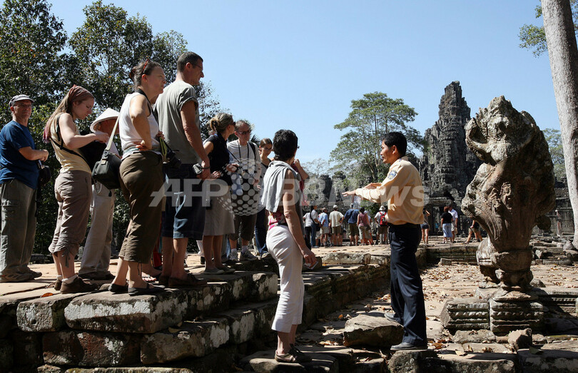 【12月7日 AFP】2007年のカンボジアへの海外旅行者数は200万人を超え、依然として観光業は同国の数少ない外貨獲得源の1つとなっている。同国では内戦から数十年がたった現在も、数百万人が貧困生活を余儀なくされている。写真はカンボジアの首都プノンペン(Phnom Penh)北西約314キロ、シエムレアプ(Siem Reap)市にあるアンコール(Angkor)遺跡内のバイヨン(Bayon)寺院を散策する観光客。(c)AFP