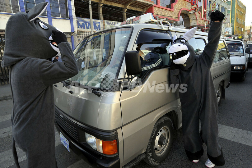 ニュース ライフ シマウマとロバの姿で交通マナーを訴える、ボリビア 2008年12月9日 23:01 発信地:エルアルト/ボリビア [ 中南米 ボリビア ] このニュースをシェア ‹ › ❮ 8/8 ❯ 南米ボリビア・エルアルト(El Alto)の路上で、ロバに変装し、信号を守らないドライバーをからかいながら注意する人々(2008年12月8日撮影)。(c)AFP/AIZAR RALDES 画像作成中 ! 【12月9日 AFP】南米ボリビア・ラパス(La Paz)近郊のエルアルト(El Alto)の路上に8日、シマウマやロバの格好をした人々が早朝から出現し、交通マナーを守ろうと訴えた。「シマウマ」たちはドライバーに歩行者優先を身振りを使って呼び掛け、「ロバ」たちはマナーを守らない人たちをユーモアを交えて注意してまわった。(c)AFP ライフ 一覧へ> メディア・報道関係・法人の方向け 写真・動画 購入のお問合せ>