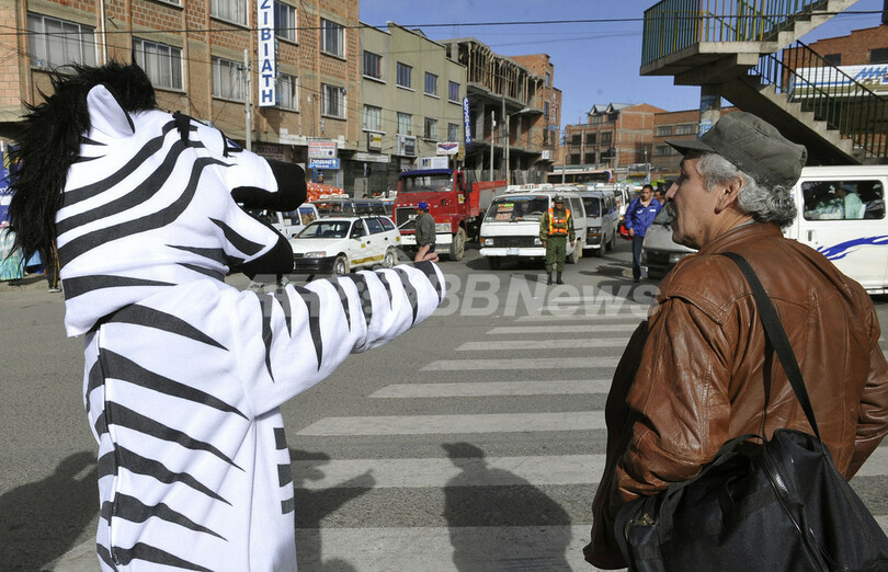 ニュース ライフ シマウマとロバの姿で交通マナーを訴える、ボリビア 2008年12月9日 23:01 発信地:エルアルト/ボリビア [ 中南米 ボリビア ] このニュースをシェア ‹ › ❮ 3/8 ❯ 南米ボリビア・エルアルト(El Alto)の路上で、シマウマに変装し、歩行者に交通マナー遵守を訴える男性(2008年12月8日撮影)。(c)AFP/AIZAR RALDES 画像作成中 ! 【12月9日 AFP】南米ボリビア・ラパス(La Paz)近郊のエルアルト(El Alto)の路上に8日、シマウマやロバの格好をした人々が早朝から出現し、交通マナーを守ろうと訴えた。「シマウマ」たちはドライバーに歩行者優先を身振りを使って呼び掛け、「ロバ」たちはマナーを守らない人たちをユーモアを交えて注意してまわった。(c)AFP ライフ 一覧へ> メディア・報道関係・法人の方向け 写真・動画 購入のお問合せ>