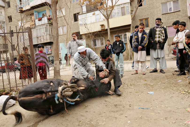 アフガニスタンで、イスラム教の犠牲祭「イード・アル・アドハ(Eid al-Adha)」のいけにえにささげる牛にナイフを入れる人々(2008年12月8日撮影)。(c)AFP/Massoud HOSSAINI