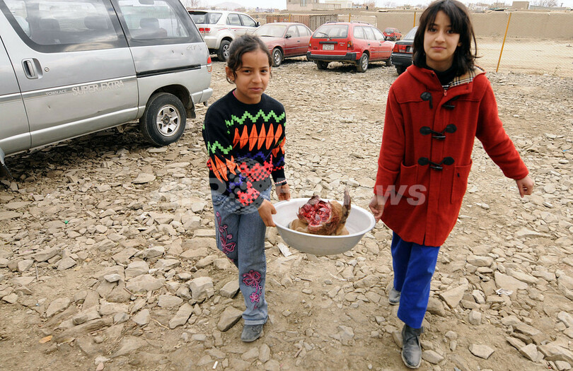 アフガニスタンで、イスラム教の犠牲祭「イード・アル・アドハ(Eid al-Adha)」のいけにえにささげられた家畜の頭を運ぶ少女たち(2008年12月8日撮影)。(c)AFP/Massoud HOSSAINI