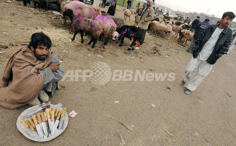 アフガニスタンで、イスラム教の犠牲祭「イード・アル・アドハ(Eid al-Adha)」のいけにえにささげる家畜をさばくためのナイフを売る男性(2008年12月8日撮影)。(c)AFP/Massoud HOSSAINI