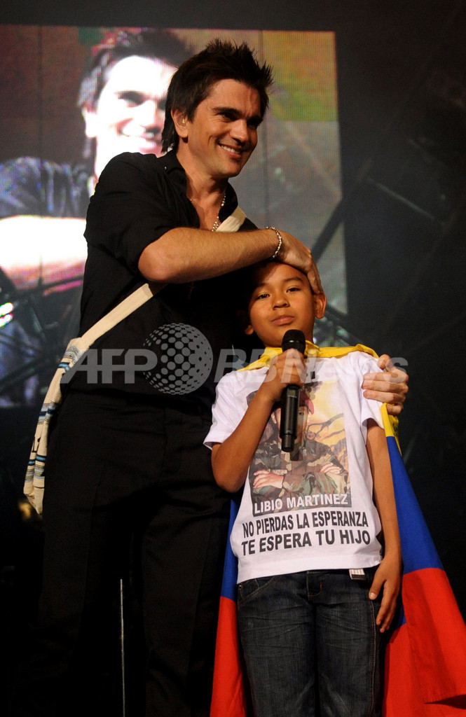 コロンビアの首都ボゴタ(Bogota)で行われたコンサートでJohan Steven Martínez(11)くんを抱きしめる、同国出身の歌手フアネス(Juanes)。