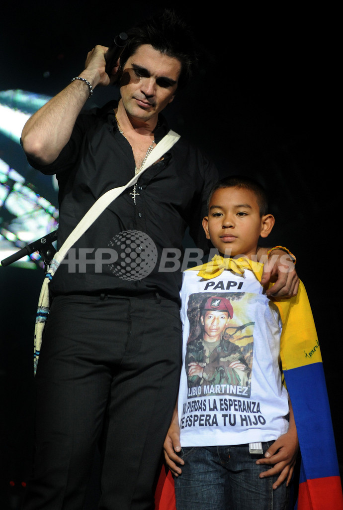コロンビアの首都ボゴタ(Bogota)で行われたコンサートでJohan Steven Martínez(11)くんを抱きしめる、同国出身の歌手フアネス(Juanes)。