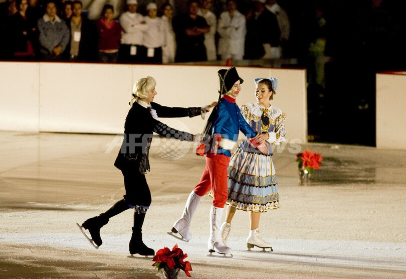 メキシコの首都メキシコ市(Mexico City)にあるソカロ広場(Zocalo Square)で初日を迎えた、チャイコフスキー(Pyotr Ilyich Tchaikovsky)作曲のバレエ『くるみ割り人形(The Nutcracker)』のアイススケート公演に出演する、ロシア人スケーターたち(2008年12月10日撮影)。(c)AFP/Alfredo Estrella