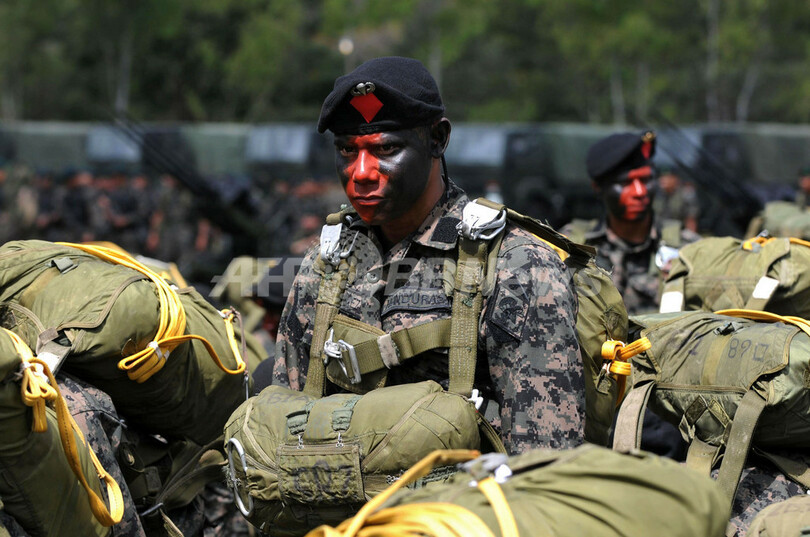 ホンジュラスの首都テグシガルパ(Tegucigalpa)南部のParada Marteキャンプで行われた、Army Dayの祝典に参加する兵士(2008年12月11日撮影)。(c)AFP/Orlando SIERRA