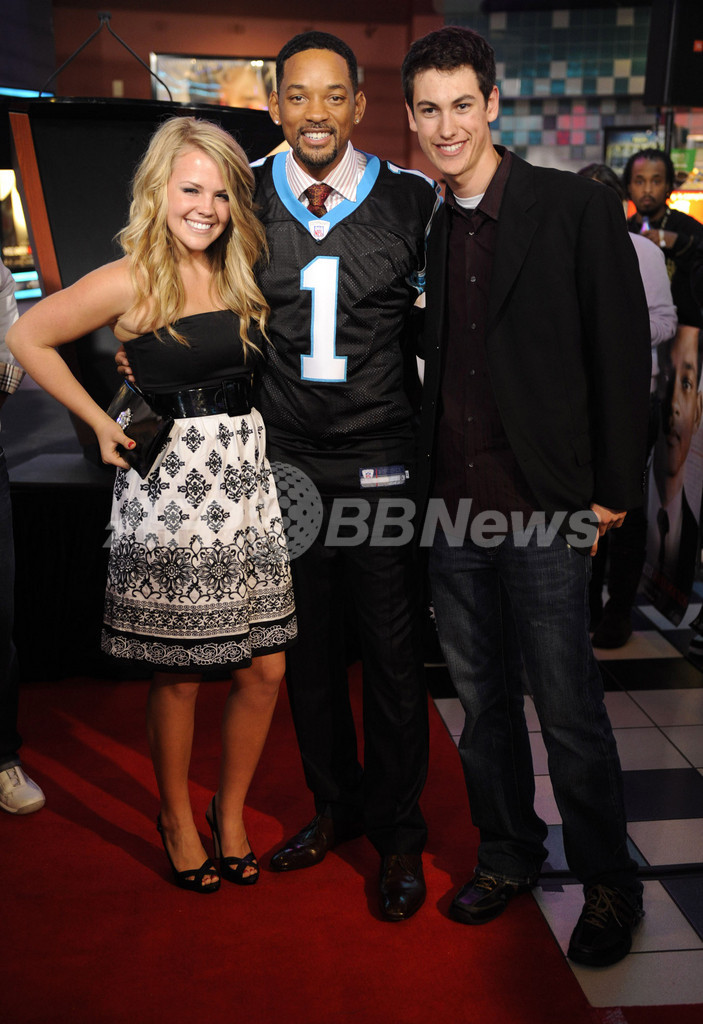 米ノースカロライナ州(North Carolina)シャーロット(Charlotte)で行われた映画『Seven Pounds』のプレミア上映会に登場した、俳優のウィル・スミス(Will Smith、中央)と、NASCARレーサーのジョーイ・ロガーノ(Joey Logano、右)、ロガーノの恋人サブリナ・シンプソン(Sabrina Simpson)さん(2008年12月11日撮影)。(c)AFP/Getty Images/Davis Turner