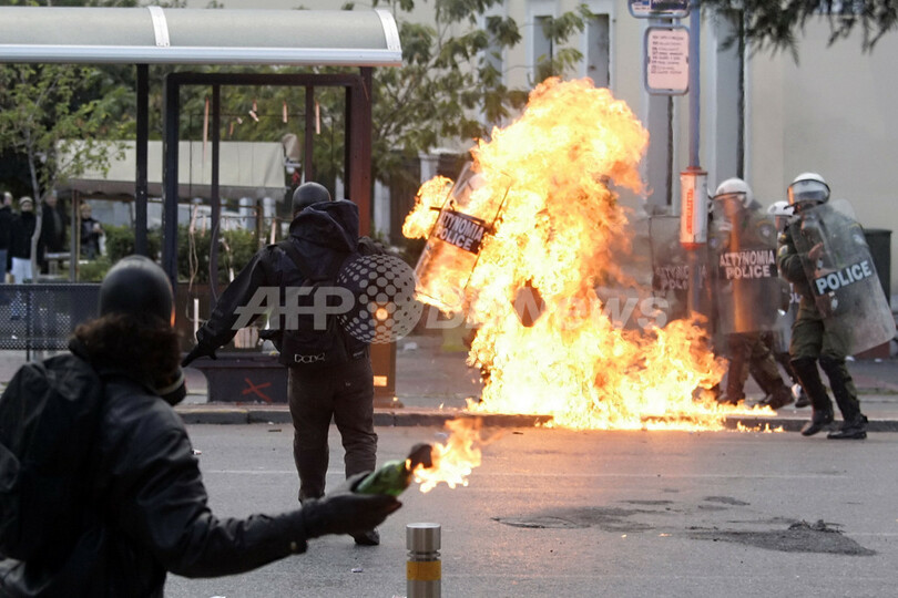 さらに、警察関係者によると、アテネ市内の3つの銀行で火炎瓶が投げ込まれる事件も発生したという。(c)AFP/Roddy Thomson