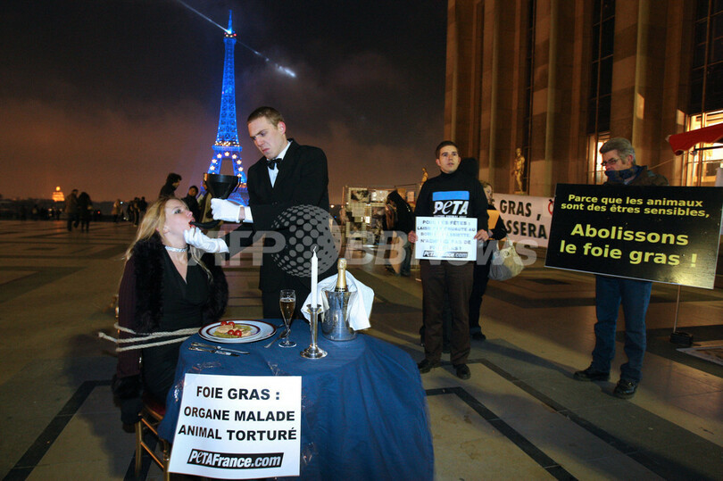 【12月15日 AFP】フランスの首都パリ(Paris)のトロカデロ(Trocadero)広場で12日、フォアグラの生産に抗議するパフォーマンスを行う、国際動物愛護団体「動物の倫理的扱いを求める人々の会(People for the Ethical Treatment of Animals、PETA)」のメンバーら。メンバーの1人がウエーターに、別のメンバーがウエーターからから無理矢やり餌を食べさせられる人に扮(ふん)している。フォアグラ生産のためのアヒルやガチョウの強制飼養に対する抗議活動の一環で、プラカードには「フォアグラ:虐待された動物の病んだ臓器」と書かれている。フォアグラはフランスで珍味とされており、昨年は世界全体の78パーセントがフランスで生産されている。(c)AFP