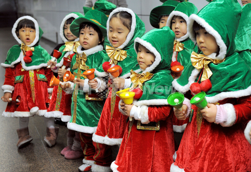ニュース ライフ ソウルで子どもたちが募金集めのベル演奏 2008年12月18日 11:34 発信地:ソウル/韓国 [ 韓国・北朝鮮 韓国 ] このニュースをシェア ‹ › ❮ 5/5 ❯ 韓国・ソウル(Seoul)の地下鉄駅構内で、救世軍(Salvation Army)の歳末募金活動のため、ハンドベルを演奏するサンタクロースの衣装を着けた子どもたち(2008年12月17日撮影)。(c)AFP/JUNG YEON-JE 画像作成中 ! 【12月18日 AFP】韓国・ソウル(Seoul)で17日、救世軍(Salvation Army)ソウル支部による生活困窮者支援のための歳末募金活動が行われ、サンタクロースの衣装を着けた子どもたちが地下鉄駅構内でハンドベルを演奏した。(c)AFP ライフ 一覧へ> メディア・報道関係・法人の方向け 写真・動画 購入のお問合せ>