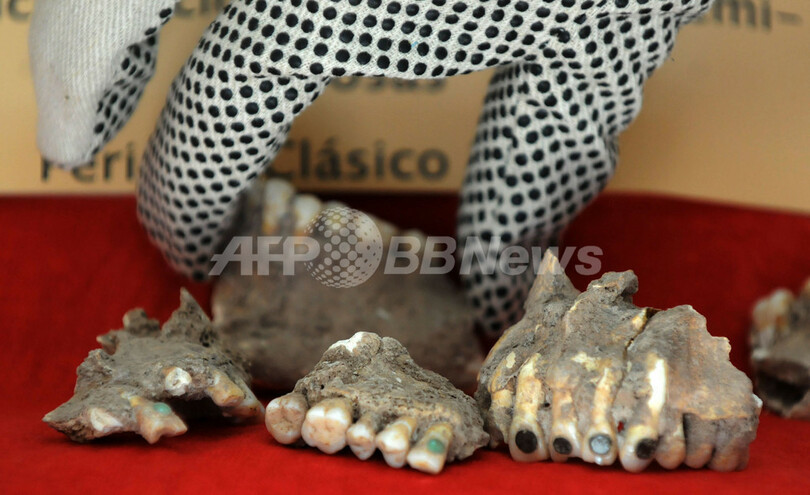 【12月17日 AFP】中米ホンジュラスの「ホンジュラス歴史人類学研究所(Honduran Institute of Anthropology and History)」が公表した、歯にヒスイを埋め込んだマヤ遺跡出土の人間の上顎骨。上顎骨はホンジュラスから盗み出されたとされるものだが、このほどオランダのホンジュラス大使館前に置き去りにされていたのが見つかり、ホンジュラスに返還された。(c)AFP