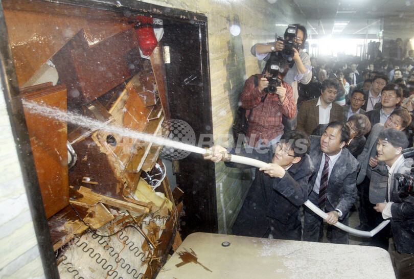 続いてのみや金づちを手にした野党議員らが会議室のドアをたたき破り、消火用ホースで室内に向けて放水したが、与党議員は即時にソファや椅子でバリケードを築いて応酬した。