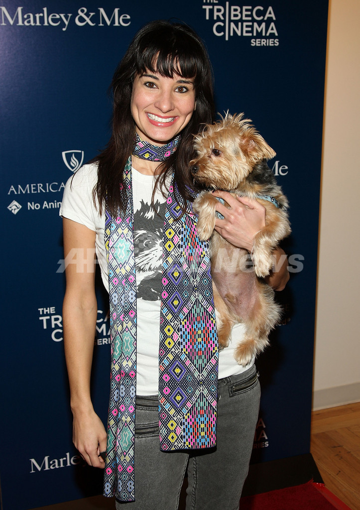 米ニューヨーク(New York)のトライベッカ・シネマ・ギャラリー(Tribeca Cinemas Gallery)で映画『マーリー 世界一おバカな犬が教えてくれたこと(Marley & Me)』のプレミア上映会に出席した、TVパーソナリティのアリソン・ベッカー(Alison Becker)と愛犬のDignan(2008年12月17日撮影)。(c)AFP/Getty Images/Stephen Lovekin