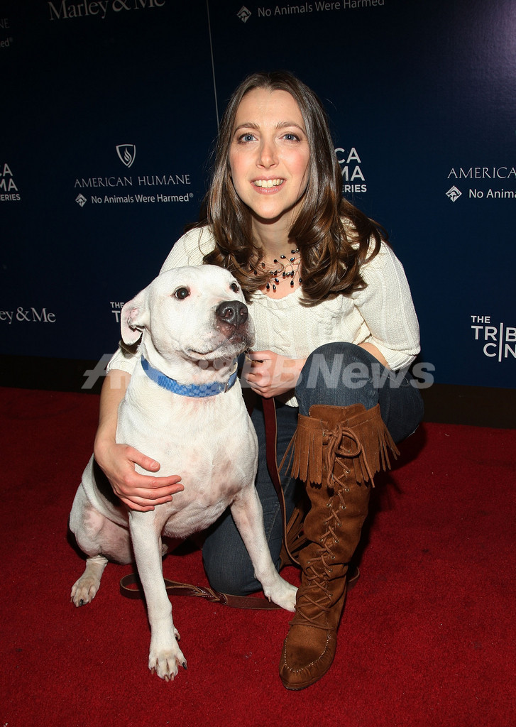 米ニューヨーク(New York)のトライベッカ・シネマ・ギャラリー(Tribeca Cinemas Gallery)で映画『マーリー 世界一おバカな犬が教えてくれたこと(Marley & Me)』のプレミア上映会に出席した、コラムニストのJulia Szaboと、愛犬Angus(2008年12月17日撮影)。(c)AFP/Getty Images/Stephen Lovekin