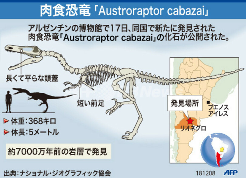 【12月19日 AFP】アルゼンチン南部パタゴニア(Patagonia)地方で新たに発見された、同地方では最大級の肉食恐竜の化石が17日、首都ブエノスアイレス(Buenos Aires)のアルゼンチン自然科学博物館(Argentine Museum of Natural Science Bernardino Rivadavia)で公開された。図は、「Austroraptor Cabazai」と名付けられた恐竜について示したもの。(c)AFP