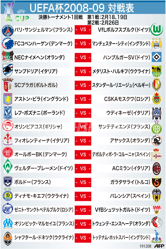 スポーツ サッカー 図解 【図解】UEFA杯2008-09対戦表 2008年12月20日 17:19 発信地:スイス [ ヨーロッパ スイス ] このニュースをシェア (c)AFP 【12月20日 AFP】サッカーUEFA杯2008-09(UEFA Cup 2008-09)決勝トーナメント1回戦の組み合わせ抽選会がスイスのニヨン(Nyon)で行われた。第1戦は2月18、19日に、第2戦は2月26日に行われる。(c)AFP<ニュース解説画像一覧へ> サッカー 一覧へ> メディア・報道関係・法人の方向け 写真・動画 購入のお問合せ>