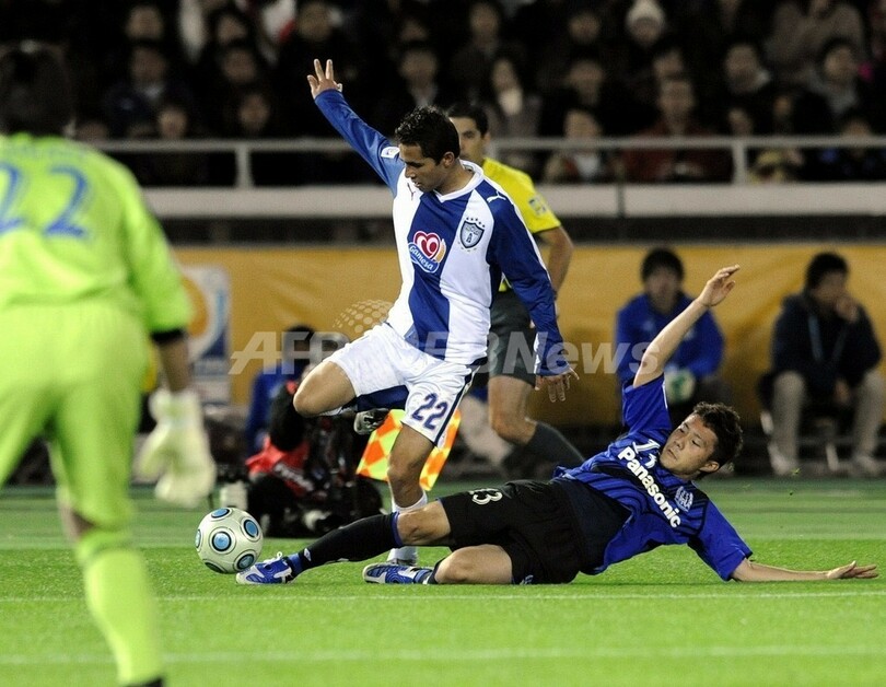 08クラブW杯(%%FIFA Club World Cup Japan 2008%%)3位決定戦、CFパチューカ(%%CF Pachuca%%、メキシコ)対ガンバ大阪(%%Gamba Osaka%%、日本)。試合はガンバ大阪が1-0でCFパチューカに勝利し、クラブ世界3位に輝いた。写真はCFパチューカのポール・アグィラー(%%Paul Aguilar%%、中央)に対しスライディングタックルに行くガンバ大阪の安田理大(%%Michihiro Yasuda%%)。(2008年12月21日撮影)(c)AFP/YOSHIKAZU TSUNO