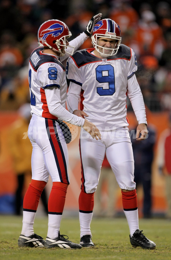 バッファロー・ビルズのキッカー(K)ライアン・リンデル(Rian Lindell)は、3本のフィールドゴールと3本のポイント・アフタータッチダウン全てを決め12得点を挙げる活躍を見せ、チームの勝利に貢献した。(c)AFP/Getty Images