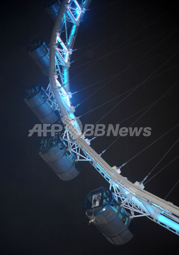 【12月23日 AFP】(一部更新、写真追加)シンガポールで23日、世界最大の観覧車「シンガポール・フライヤー(Singapore Flyer)」が電源異常で運転中に停止し、乗客100人以上が約6時間にわたって閉じ込められた。