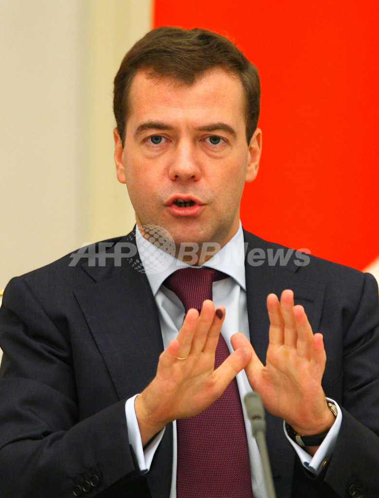 同日、ロシアのドミトリー・メドベージェフ(Dmitry Medvedev)大統領は、ロシアのテレビ局の年末インタビューで、金融危機に直面しているウクライナに対し、ガス債務を「最後の1ルーブルまで」全額支払わなければ、ウクライナは制裁措置に直面するだろうと語った。(c)AFP/Stuart Williams