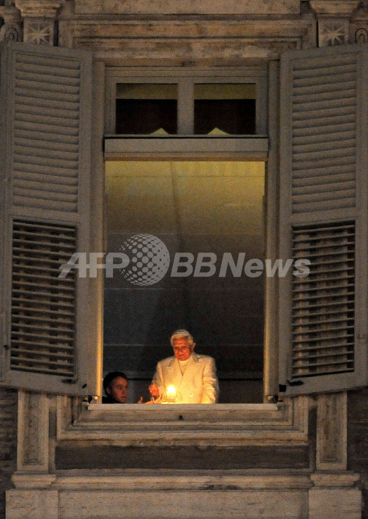 【12月25日 AFP】クリスマスイブを迎えたバチカンで24日、ローマ法王ベネディクト16世(Benedict XVI)がサンピエトロ広場(St Peter's Square)を見下ろす居室のバルコニーに姿を現してろうそくを灯し、深夜ミサが幕を開けた。