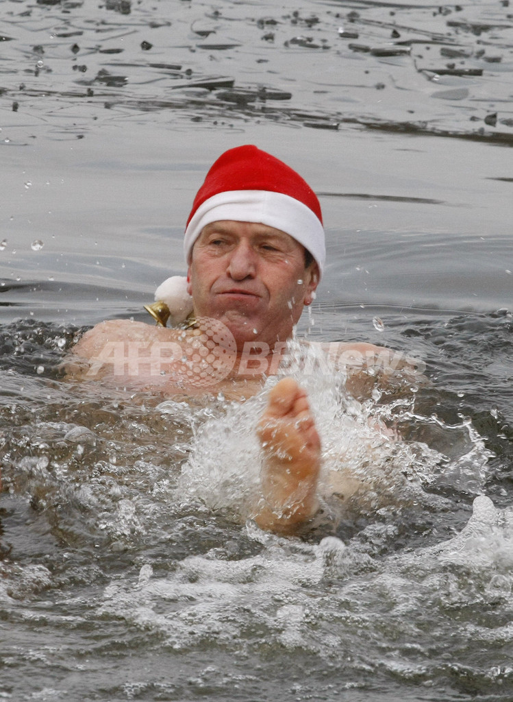 ドイツ東部のツェーデニク(Zehdenick)にあるグリューンシュティヒ(Gruenstich)湖で、氷の張った湖で寒中水泳を行うスポーツ団体「Lupus-Team Zehdenick - Polar Wolves」のメンバー。湖に入る前に、7キロのランニングを行う。この団体は毎年クリスマス2日目の26日に集い、この催しを行っている(2008年12月26日撮影)。(c)AFP/DDP/MICHAEL URBAN