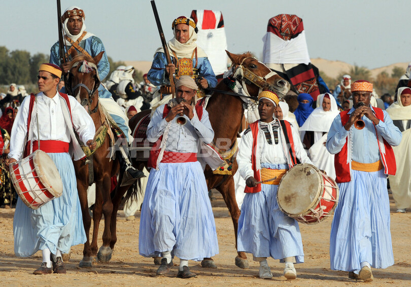 チュニジア南西部のドゥーズ(Douz)で25日、第41回「サハラ国際フェスティバル(Sahara International Festival )」のオープニングで披露された伝統的なパフォーマンス。同フェスティバルは25-26日、砂漠の遊牧民とその文化を称えるイベントとして開催され、訪れた地元の人々や観光客らを楽しませた(2008年12月25日撮影)。(c)AFP/FETHI BELAID