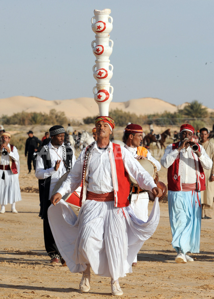 チュニジア南西部のドゥーズ(Douz)で25日、第41回「サハラ国際フェスティバル(Sahara International Festival )」のオープニングで、パフォーマンスをする男性。同フェスティバルは25-26日、砂漠の遊牧民とその文化を称えるイベントとして開催され、訪れた地元の人々や観光客らを楽しませた(2008年12月25日撮影)。(c)AFP/FETHI BELAID