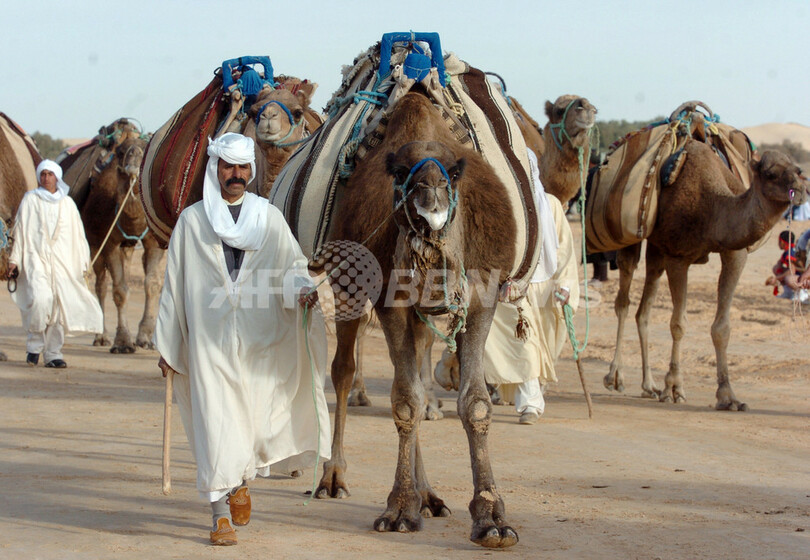 チュニジア南西部のドゥーズ(Douz)で25日、第41回「サハラ国際フェスティバル(Sahara International Festival )」のオープニングで、ラクダを連れて歩く人。同フェスティバルは25-26日、砂漠の遊牧民とその文化を称えるイベントとして開催され、訪れた地元の人々や観光客らを楽しませた(2008年12月25日撮影)。(c)AFP/FETHI BELAID