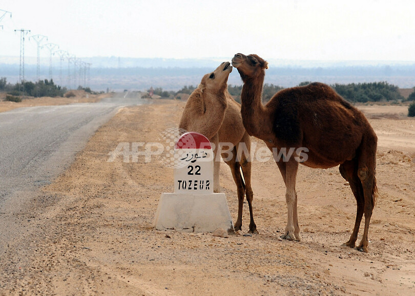 チュニジア南西部のドゥーズ(Douz)近郊のTozeurで寄り添い合うラクダ。ドゥーズで25-26日開催された第41回「サハラ国際フェスティバル(Sahara International Festival )」は、砂漠の遊牧民とその文化を称えるイベントで、訪れた地元の人々や観光客らを楽しませた(2008年12月25日撮影)。(c)AFP/FETHI BELAID