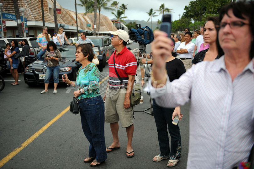 米ハワイ(Hawaii)のハワイカイ(Hawai'i Kai)の屋外ショッピングモールに娘たちと現れたバラク・オバマ(Barack Obama)次期米大統領の写真をとる人々(2008年12月26日撮影)。(c)AFP/TIM SLOAN