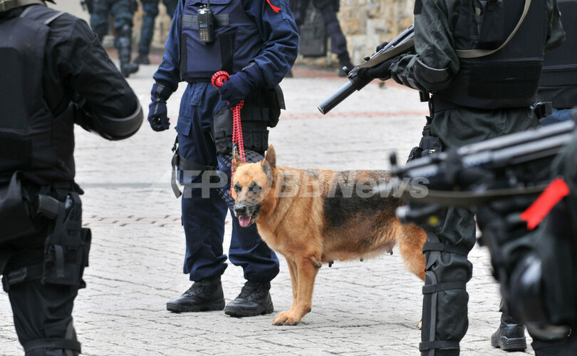 インドネシア・ジャカルタ(Jakarta)の高級ホテルで行われたテロ対策訓練で待機する軍用犬。この対テロ演習は、11月のインド・ムンバイ同時襲撃事件でホテルを受け、同様の事態を想定して行われた。インドネシアではイスラム武装勢力のテロ事件が幾度も起きているが、2005年のバリ島での自爆テロ以降は大きな事件は発生していない(2008年12月21日撮影)。(c)AFP/Bay ISMOYO