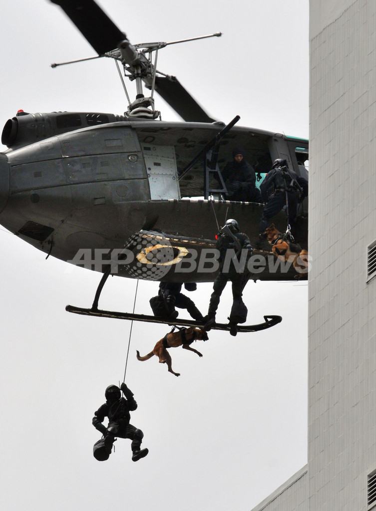 インドネシア・ジャカルタ(Jakarta)の高級ホテルで行われたテロ対策訓練で降下する兵士と軍用犬。この対テロ演習は、11月のインド・ムンバイ同時襲撃事件でホテルを受け、同様の事態を想定して行われた。インドネシアではイスラム武装勢力のテロ事件が幾度も起きているが、2005年のバリ島での自爆テロ以降は大きな事件は発生していない(2008年12月21日撮影)。(c)AFP/Bay ISMOYO