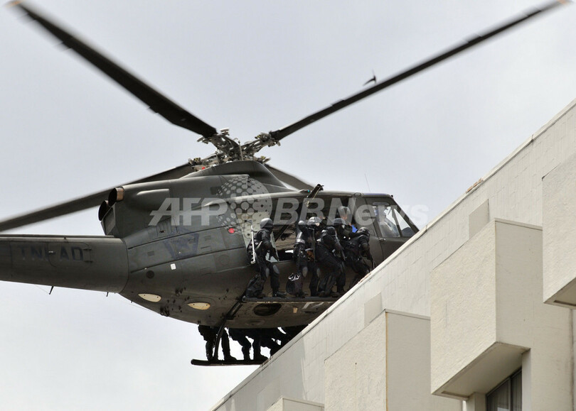 インドネシア・ジャカルタ(Jakarta)の高級ホテルでテロ対策訓練を行うインドネシア軍の対テロ部隊。この対テロ演習は、11月のインド・ムンバイ同時襲撃事件でホテルを受け、同様の事態を想定して行われた。インドネシアではイスラム武装勢力のテロ事件が幾度も起きているが、2005年のバリ島での自爆テロ以降は大きな事件は発生していない(2008年12月21日撮影)。(c)AFP/Bay ISMOYO