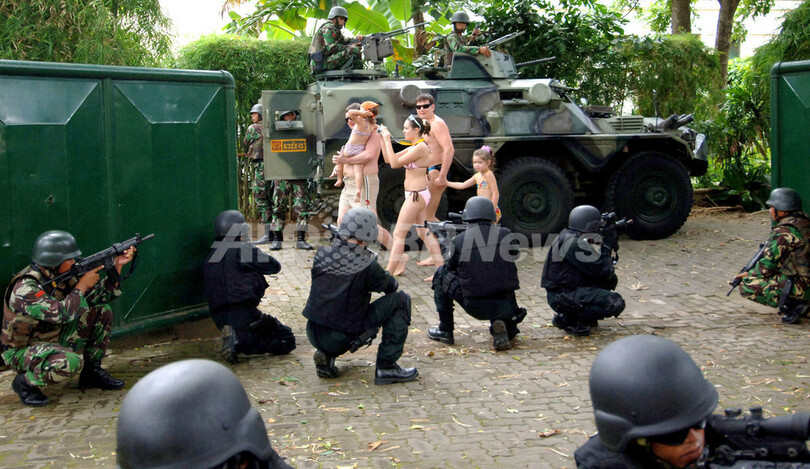 インドネシア・デンパサール(Denpasar)のクタビーチ(Kuta beach)で、インドネシア治安部隊が行うテロ対策訓練の中を歩く観光客。この対テロ演習は、11月のインド・ムンバイ同時襲撃事件でホテルを受け、同様の事態を想定して行われた。インドネシアではイスラム武装勢力のテロ事件が幾度も起きているが、2005年のバリ島での自爆テロ以降は大きな事件は発生していない(2008年12月21日撮影)。(c)AFP/Sonny TUMBEKALA