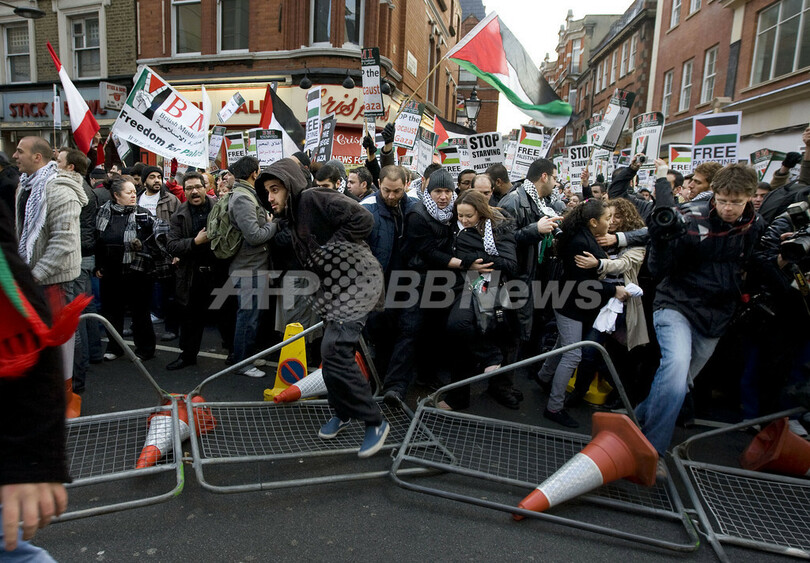 28日、ロンドン(London)のイスラエル大使館前では、抗議デモが暴徒化して大使館の防護柵を破壊し、英警察の機動隊が出動して10人を拘束する事態となった。