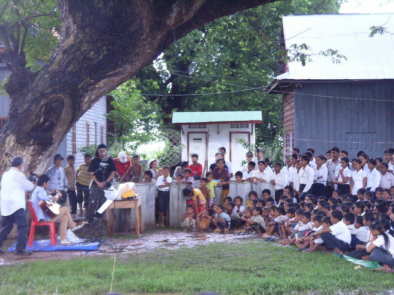 ボラヴィーちゃんの学校のお友だちや村人たち約500人が見守る中、河口さんの優しい歌声が、スコールが上がったばかりのカンボジアの青空に響き渡りました。村人にとっては初めてのコンサート。皆、うっとりと聴き入りました。
