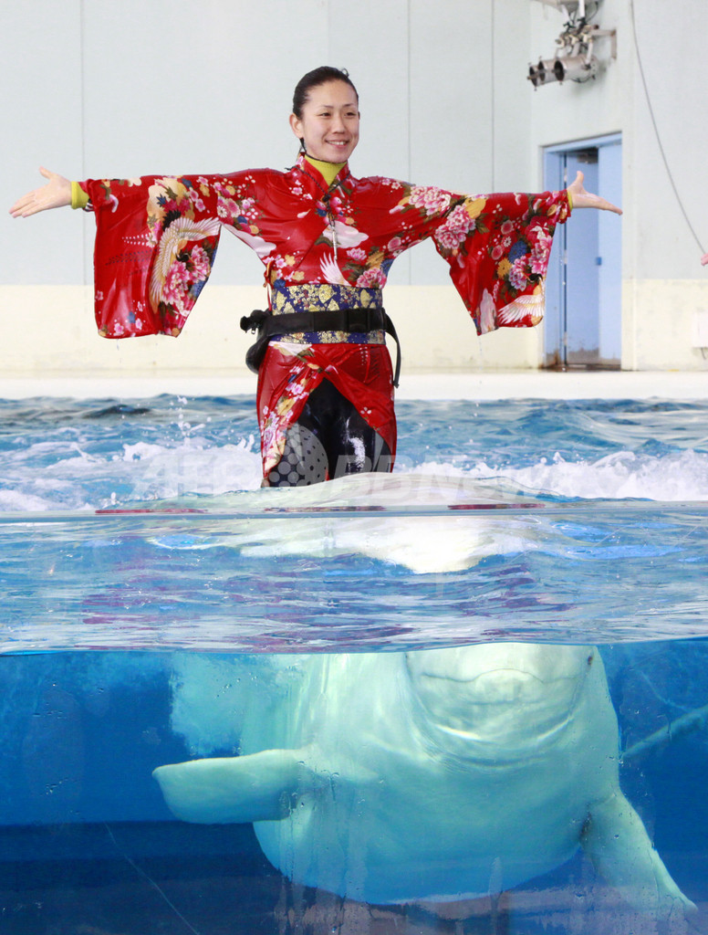 【12月31日 AFP】神奈川県横浜市の横浜・八景島シーパラダイス(Yokohama Hakkijima Sea Paradise)で、新年のショーに向け着物姿でシロイルカに乗る練習をするアニマルトレーナー。(c)AFP