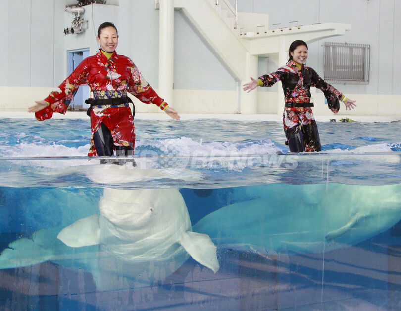 新年に向け準備万端、シロイルカのショー