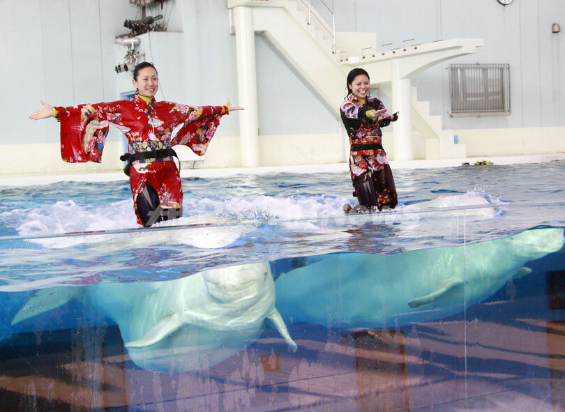 新年に向け準備万端、シロイルカのショー