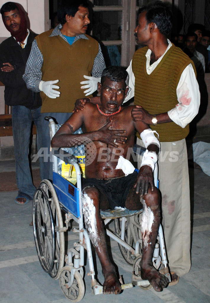 インド・アッサム(Assam)州グワハティ(Guwahati)の市場で、爆弾の爆発で負傷し病院へ搬送される被害者(2009年1月1日撮影)。(c)AFP/BIJU BORO
