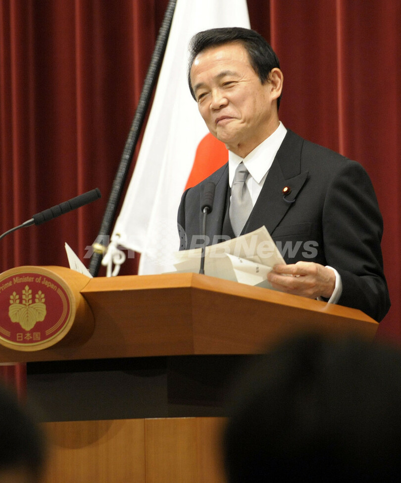 【1月4日 AFP】(写真追加)麻生太郎(Taro Aso)首相は4日午前、記者会見を行い、経済問題への対応と予算と関連法案の成立に集中する必要性を強調し、少なくとも数か月は解散・総選挙を行う考えがないと表明した。
